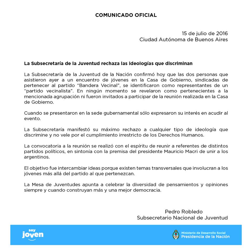 El subsecretario de Juventud, Pedro "Piter" Robledo emitió un comunicado para rechazar las críticas tras la decisión de incluir entre los invitados a una reunión en Casa Rosada a referentes del partido neonazi Bandera Vecinal.