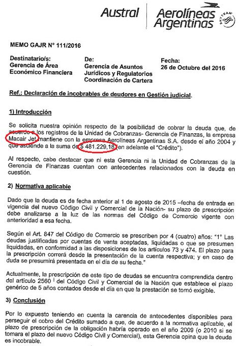El diputado aportó la resolución de la gerencia de legales de la línea de bandera, en la cual se considera prescripto este pasivo, se declara un deudor "incobrabable" al Correo, y que desiste de llevar esta deuda de la familia Macri ante la justicia.