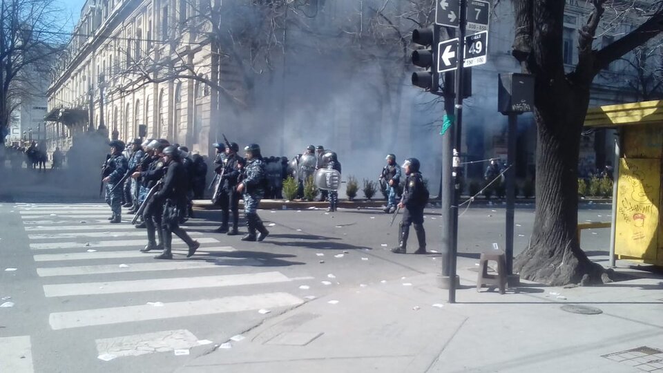 A pocas cuadras de donde los organismos de Derechos Humanos despedían a una de las fundadoras de Abuelas de Plaza de Mayo, Chicha Mariani, la policía de la provincia de Buenos Aires reprimió una masiva manifestación en el centro de La Plata contra el eventual cierre del astillero. Hay varios detenidos.