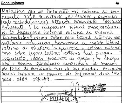 Las actas médicas del hospital Ramos Mejía, donde fue atendido el oficial de la Doucad, diagnostican un "traumatismo en mano y muñeca izquierda" y recomiendan inmovilizar el brazo por 48 horas y ponerse hielo 3 a 4 veces por día. Por su parte, el informe médico legal habla de "traumatismo y edema sobre cara lateral externa del antebrazo izquierdo" y "hematoma y edema en el pulgar izquierdo".