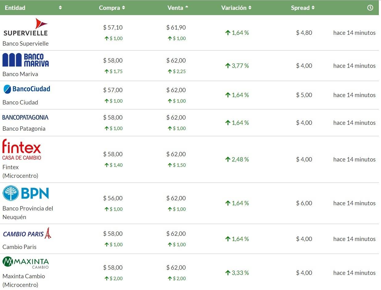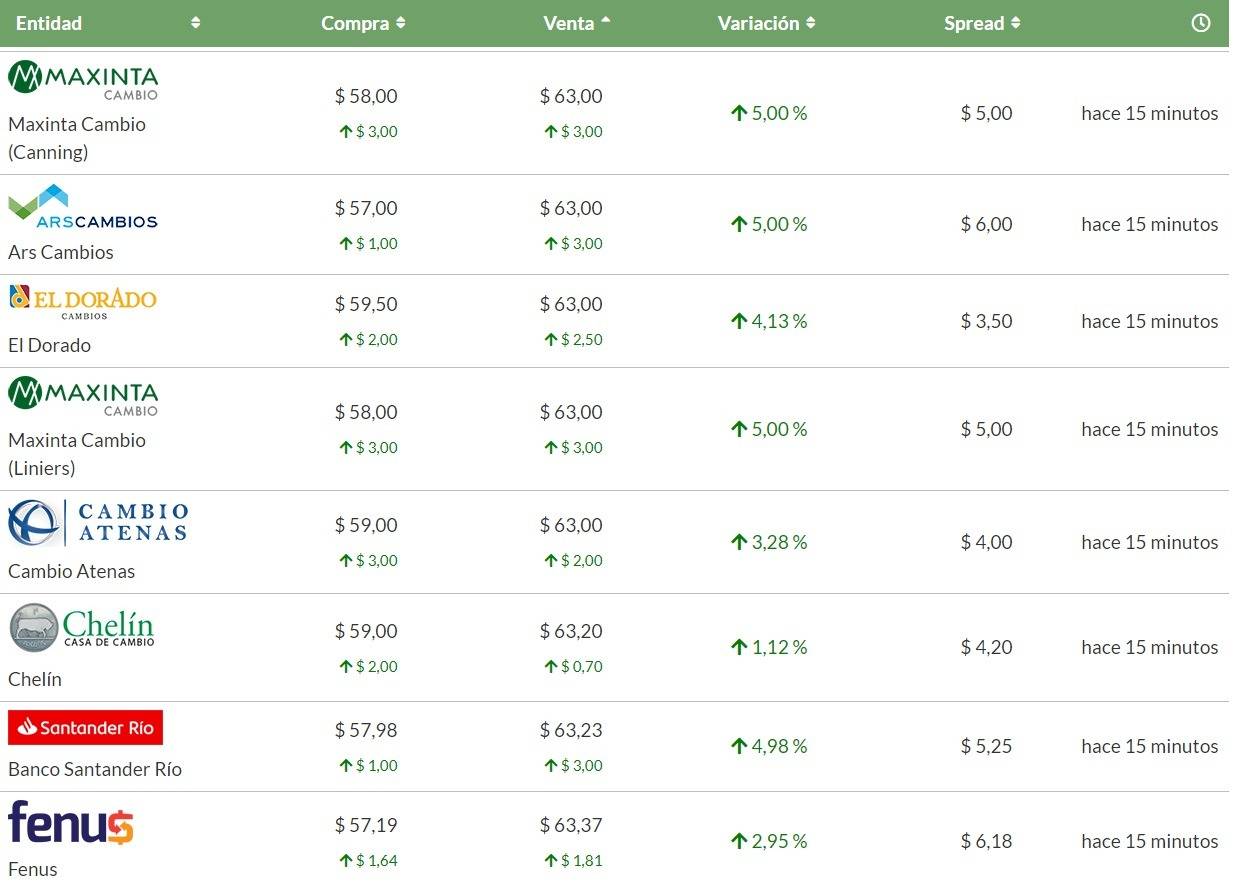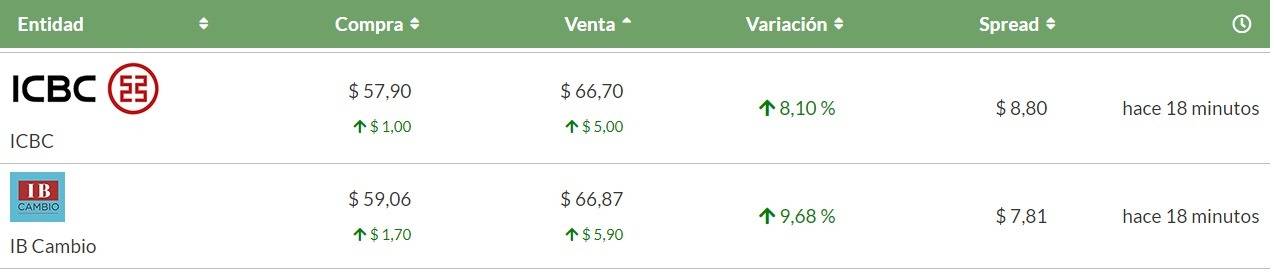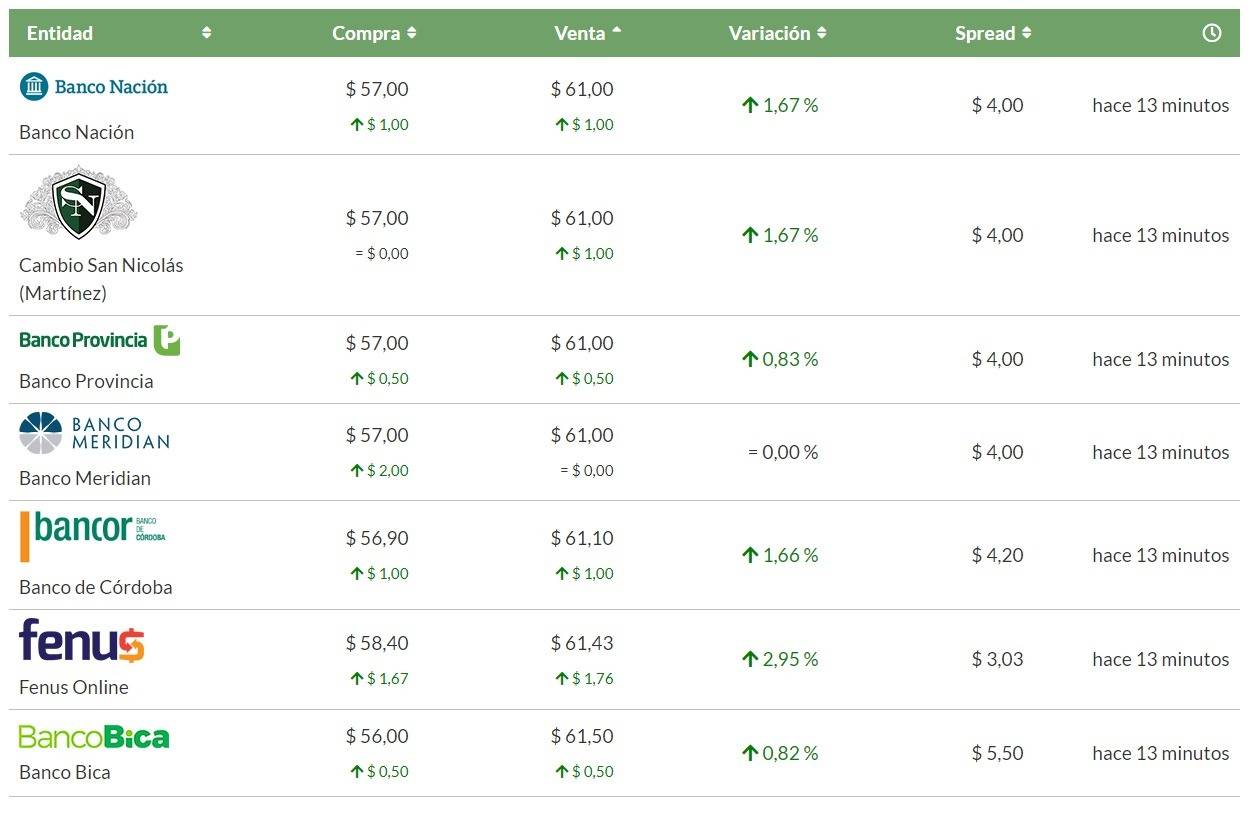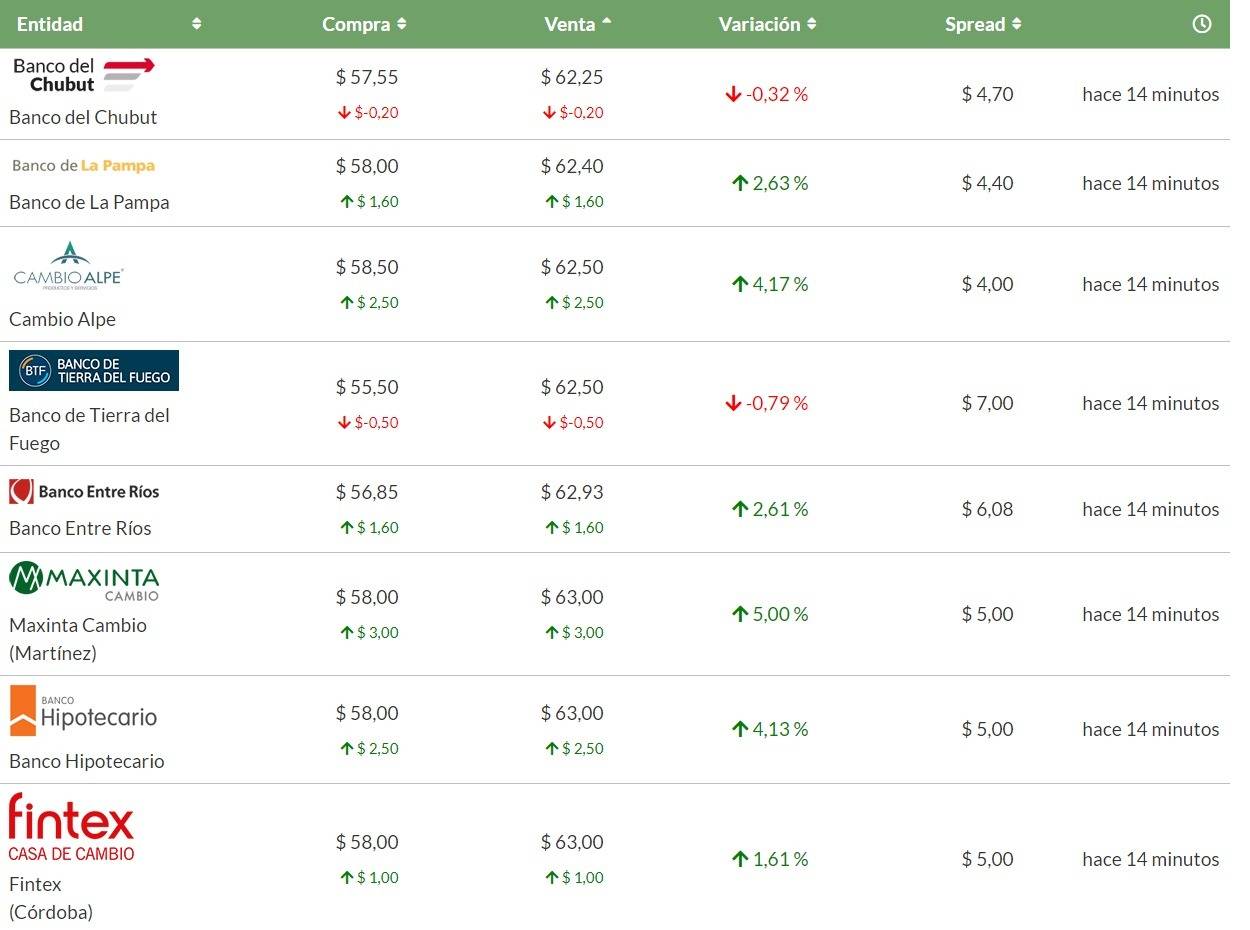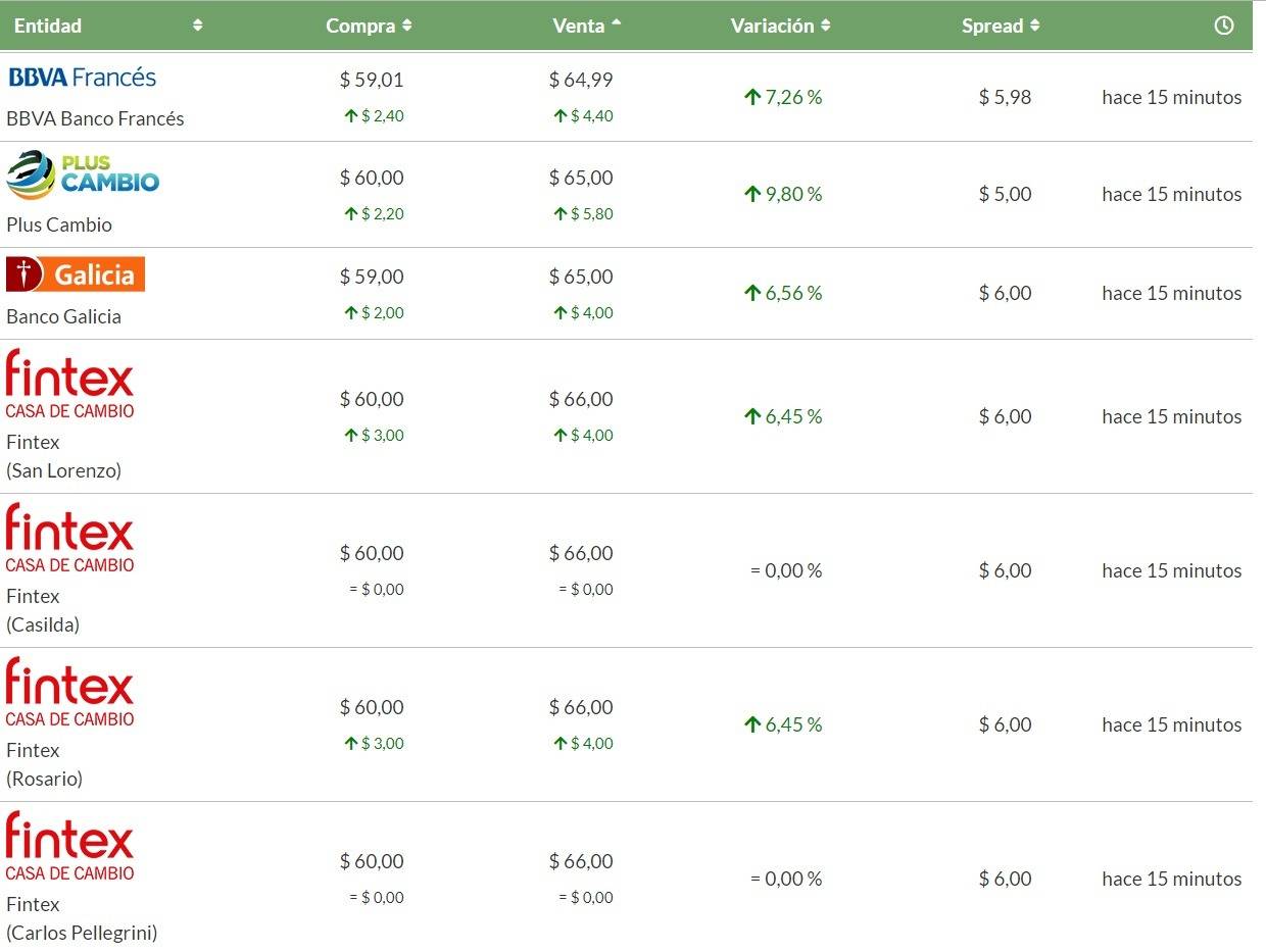 De esta forma, en el ICBC el precio de venta minorista es de $66,70 , en el BBVA es de $64,99, en el Banco Comafi $64, en Santander es de $63,63 y en el Banco Galicia es de $65.