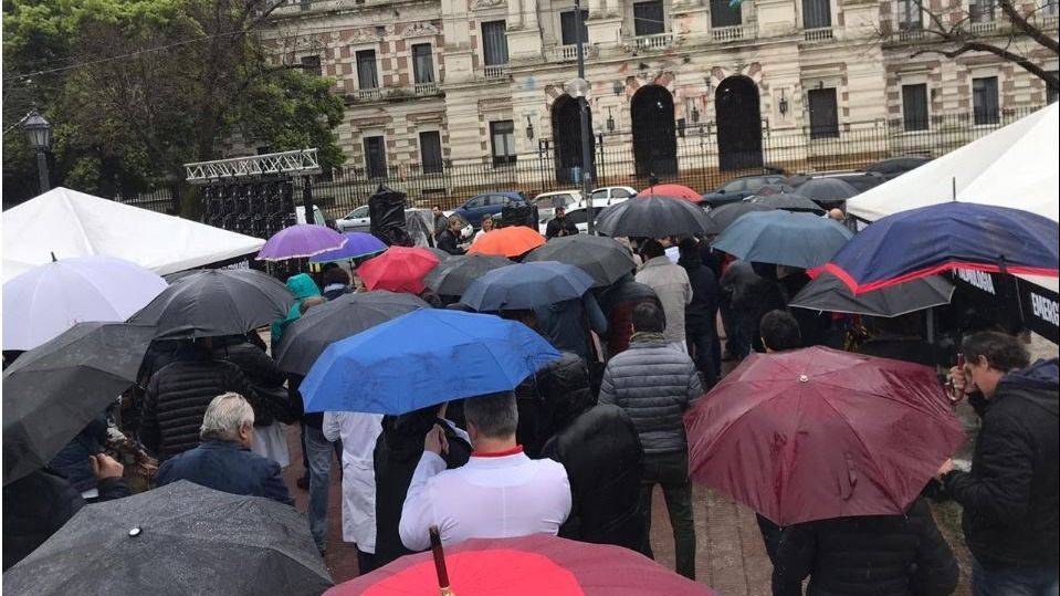 Decenas de médicos protestan en la Plaza San Martín frente a la Casa de Gobierno bonaerense en reclamo de que la obra social de la provincia de Buenos Aires (IOMA) cumpla con la implementación de los nuevos nomencladores que determinan el costo de los servicios médicos y en rechazo de las demoras en el incremento de salarios. Los trabajadores de la salud alertan que hay pacientes oncológicos que deben esperar casi dos meses para que les aprueben una cirugía de urgencia. En los últimos dos años, al menos tres personas con cáncer murieron a la esperaban de sus medicamentos.