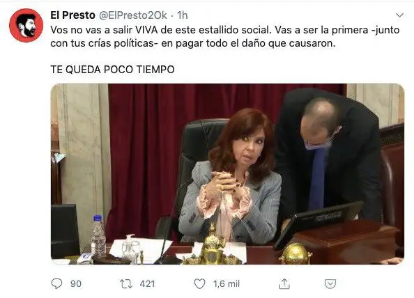 El periodista anti K, que se esconde detrás de un seudónimo en las redes sociales, lanzó una amenaza de muerte contra Cristina Kirchner al capturar una imagen y escribir: "Vos no vas a salir a salir viva de este estallido social". Además, en su cuenta de Twitter conocida como @ElPresto2OK, el comunicador agregó: "vas a ser la primera -junto a tus crías políticas- en pagar todo el año que causaron" y, finalmente, cierra con un "te queda poco tiempo"