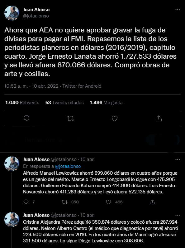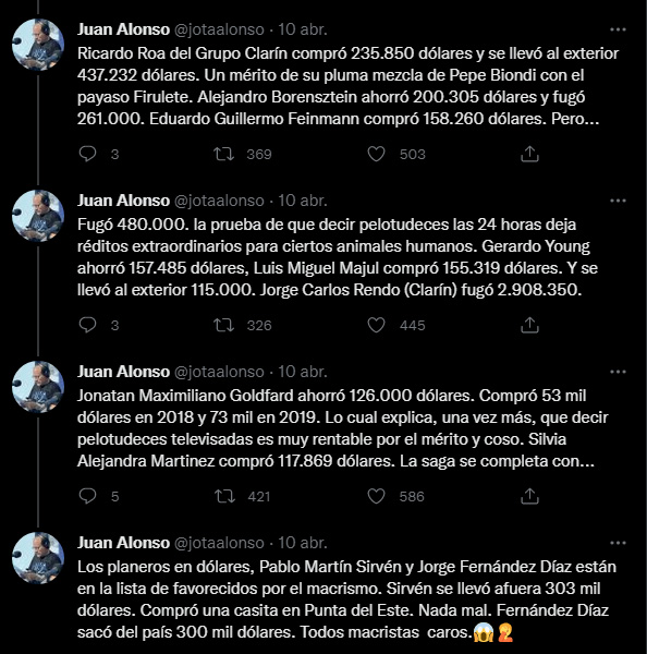 El periodista Juan Alonso develó el ranking de los operadores mediáticos que más dinero amasaron durante el régimen macrista. Además de cobrar suculentos dividendos, transfirieron sus fortunas al exterior.