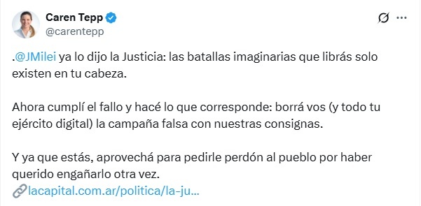 En su cuenta de X, la candidata santafesina expresó: "Milei, ya lo dijo la Justicia: las batallas imaginarias que librás solo existen en tu cabeza. Ahora cumplí el fallo y hacé lo que corresponde: borrá vos (y todo tu ejército digital) la campaña falsa con nuestras consignas. Y ya que estás, aprovechá para pedirle perdón al pueblo por haber querido engañarlo otra vez".