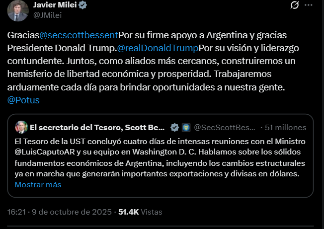 En otra publicación, Milei agradeció directamente al secretario del Tesoro estadounidense, Scott Bessent, por su apoyo a Argentina, y al presidente Donald Trump, destacando su visión y liderazgo. “Juntos, como aliados más cercanos, construiremos un hemisferio de libertad económica y prosperidad. Trabajaremos arduamente cada día para brindar oportunidades a nuestra gente”, sostuvo.