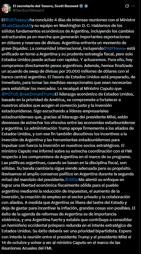 “Argentina enfrenta un momento de grave iliquidez. La comunidad internacional, incluyendo @IMFNews, está unificada en torno a Argentina y su prudente estrategia fiscal, pero solo Estados Unidos puede actuar con rapidez”, señaló Bessent, en su cuenta de X. En el extenso mensaje, agregó: “A medida que Argentina se libera del lastre del Estado y deja de gastar para incentivar la inflación, grandes cosas serán posibles”.