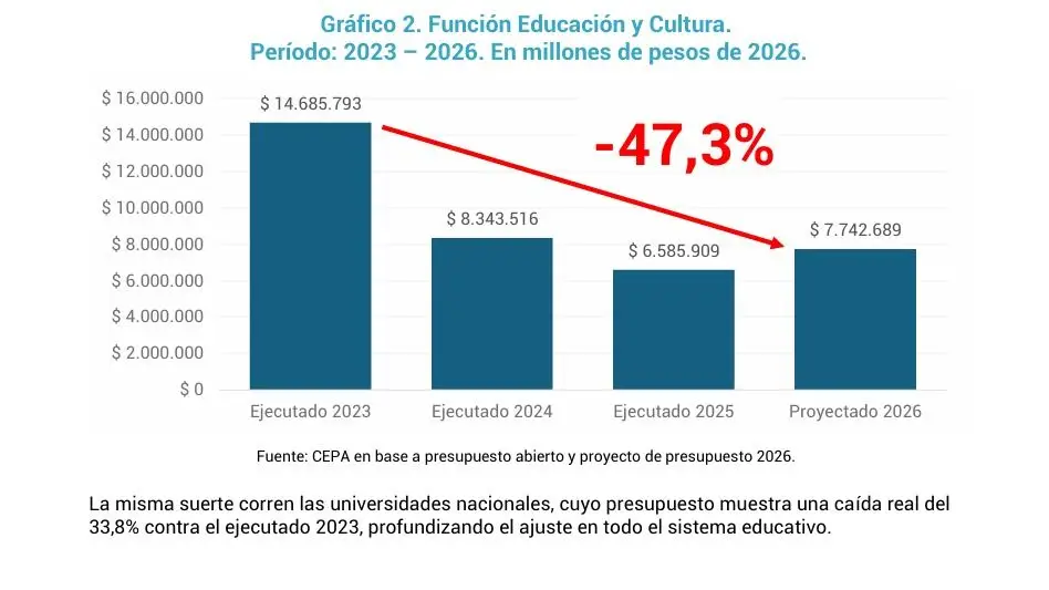 “La industria argentina genera cerca de 2,6 millones de empleos y eso tiene un soporte que no puede tirarse por la borda”, planteó Capitanich, quien recordó que la ley de Educación Técnica se sancionó durante el gobierno de Néstor Kirchner para jerarquizar y fortalecer esa enseñanza en los niveles secundario, superior y de formación profesional, vinculándola con el desarrollo productivo y el mundo laboral. Se cumplió a rajatabla a excepción del gobierno de Mauricio Macri y durante la pandemia, hasta la caída abrupta desde el inicio de la gestión de Javier Milei. El trabajo de CEPA mostró que no sólo el presupuesto bajó año a año sino que ni siquiera se ejecutó lo presupuestado. Además, el ajuste en la educación técnico-profesional se inscribe en un recorte presupuestario mucho más amplio. La Función Educación y Cultura presenta una caída real del 47,3% en el Presupuesto 2026 respecto de lo efectivamente ejecutado en 2023.