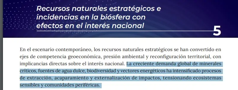 “La creciente demanda global de minerales críticos, fuentes de agua dulce, biodiversidad y vectores energéticos ha intensificado procesos de extracción, acaparamiento y externalización de impactos, tensionando ecosistemas sensibles y comunidades periféricas”, puede leerse en el documento de la SIDE.