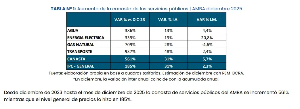 El informe también destaca que desde diciembre de 2023 hasta este mes la canasta de servicios públicos del AMBA se incrementó 561%, mientras que el Índice de Precios al Consumidor (IPC) que mide el INDEC lo hizo en 185%.