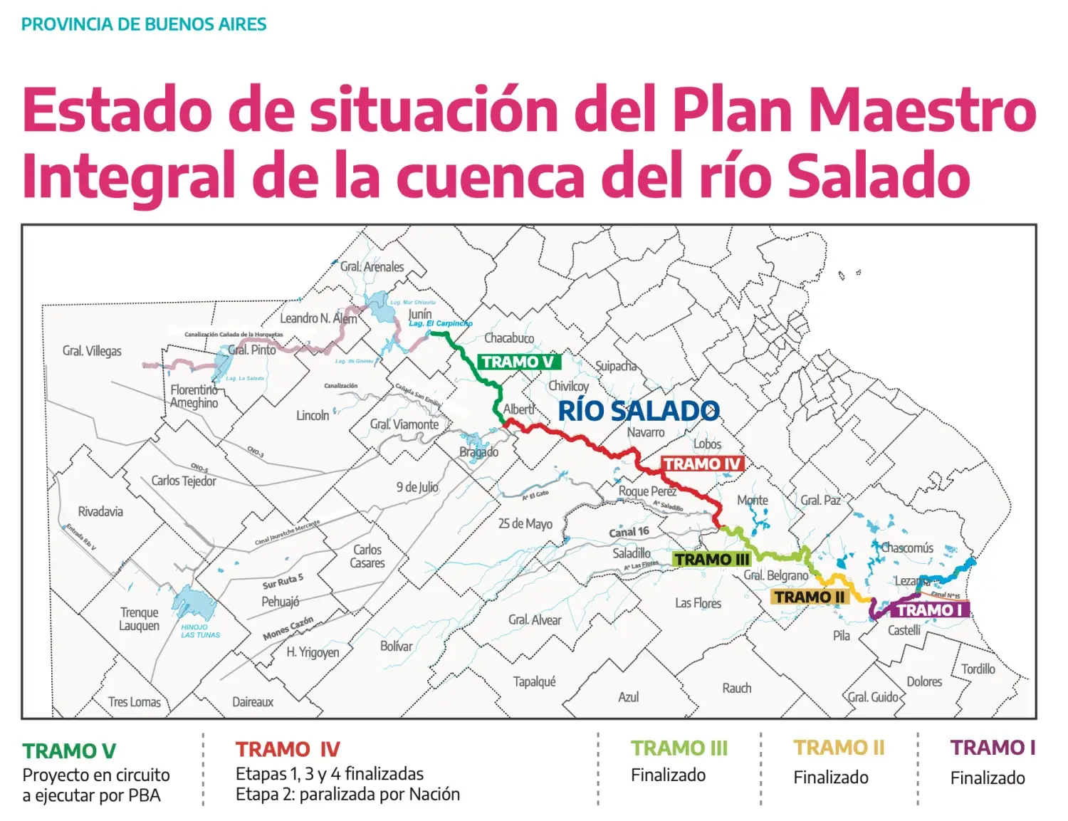 El financiamiento y la ejecución de las 4 etapas del tramo IV están a cargo del Gobierno Nacional, a excepción de la etapa 1B; que fue ejecutada y finalizada por la provincia de Buenos Aires a partir de un préstamo del Banco Mundial. Semanas atrás, el ministro de Gobierno bonaerense, Carlos Bianco, se refirió a las anegaciones que hubo por el Río Salado y apuntó contra la paralización de obras que decidió el presidente libertario. “Milei decidió que no haya obra pública”, dijo.