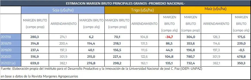 "El margen bruto para campo propio en soja logro su segundo año consecutivo de altos márgenes y, más allá del trigo, el maíz fue el otro grano con márgenes superiores a la soja", explicó a El Destape Ernesto Mattos, director Instituto para el Desarrollo Productivo y la Innovación de la Universidad Nacional de José C. Paz. "Desde la campaña 2019/20 se triplicó en campo propio y campo alquilado", agregó el especialista.