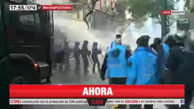 La Policía de la Ciudad reprimió con camiones hidrantes, gases lacrimógenos y bastones a los manifestantes que fueron a la casa de Cristina Kirchner en Recoleta para apoyar a la vicepresidenta luego de que los fiscales Sergio Mola y Diego Luciani pidieran 12 años de cárcel en la causa por la Obra Pública y su proscripción perpetua para ocupar cargos públicos.