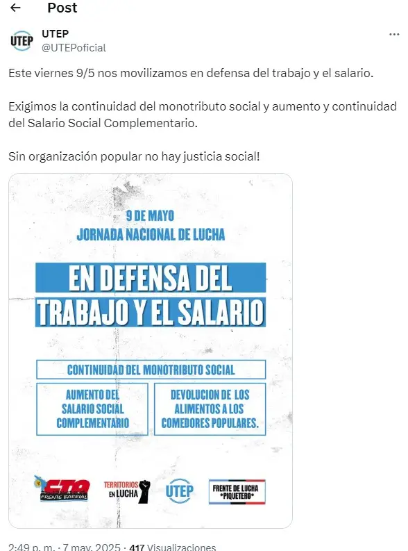 “A 17 meses de la asunción del gobierno de Milei, los datos son alarmantes: crece el hambre, aumentan los despidos y la desocupación, se derrumban los salarios y las jubilaciones. El trabajo informal, autogestionado y las changas están al borde del colapso por la caída del consumo y el freno total de la economía”, sostiene el comunicado de la organización.