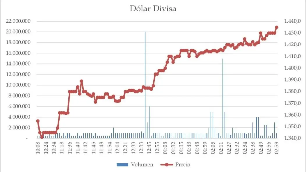Pero en el mercado oficial de cambios la divisa arrancó en un piso de 1.380 pesos y peleas poco volumen operado, de 300 millones de dólares, terminó demandado y en 1.435 pesos, mientras en futuro se operaron 1.857 millones con tasa negativa para este mes pero todavía por encima de la banda de flotación en los contratos a partir de diciembre.