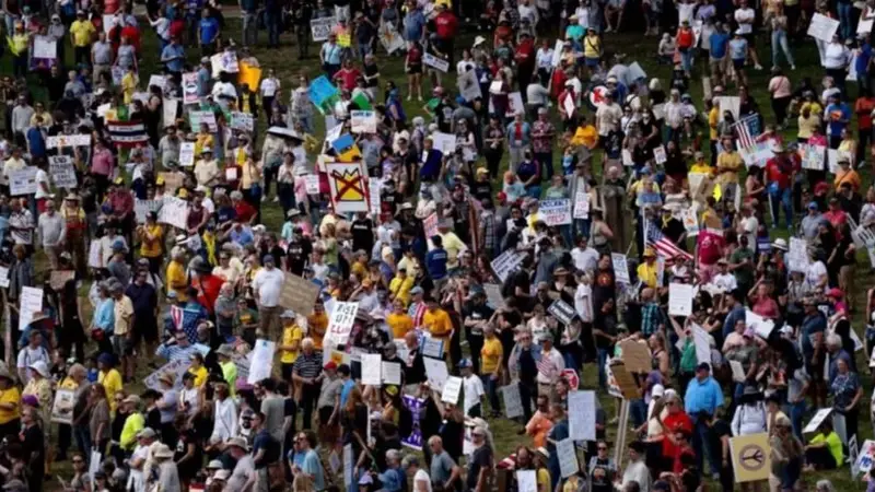 En medio del salvataje al gobierno argentino, en cientas de ciudades de EEUU hubo manifestantes que salieron a advertir que "la democracia está siendo amenazada" bajo la segunda gestión de Donald Trump.