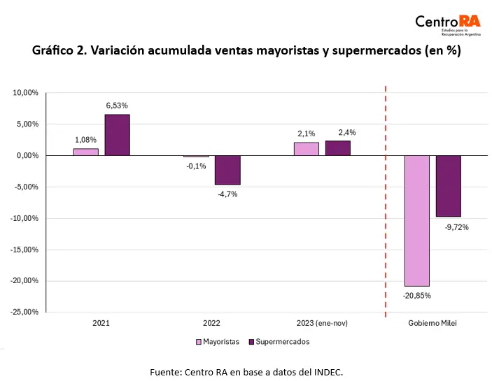 Si se pone la lupa en la dinámica del mercado interno se observa una profundización de la caída en la medida en que las ventas continúan muy por detrás del inicio de la gestión de Javier Milei: en el caso de los autoservicios mayoristas, desde el inicio del actual gobierno se registra una contracción acumulada del 20,8%, mientras que las ventas de los supermercados acumulan una caída de aproximadamente 9,7%, detallaron los especialistas de la UBA.