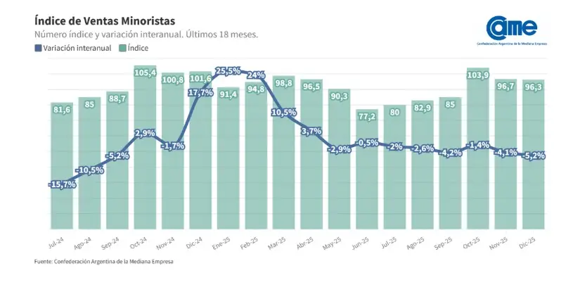 Al analizar el escenario relevado, desde CAME sostuvieron que “diciembre funcionó como un alivio financiero gracias a las fiestas de fin de año y al cobro de aguinaldos, pero no logró revertir la caída estructural del 5,2%”.
