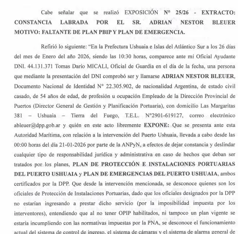 El texto de la cautelar presentado por el Gobernador Melella contiene la exposición de Adrián Néstor Bleuer, empleado de la Dirección Provincial de Puertos, formulada ante un oficial de la Prefectura Naval el pasado 26 de enero. Allí quedaron registradas una serie de irregularidades surgidas a partir de la intervención del Poder Ejecutivo Nacional. En las palabras de Bleuer se aprecia un riesgo inminente:
