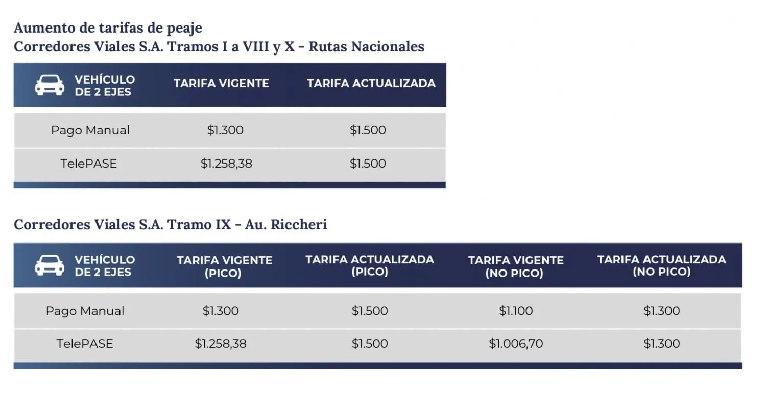 Por su parte, los usuarios de TelePASE en la Autopista Riccheri también verán un ajuste: en horario pico la tarifa vigente de $1.258,38 se eleva a $1.500, y en horario no pico el valor de $1.006,70 se actualiza a $1.300.