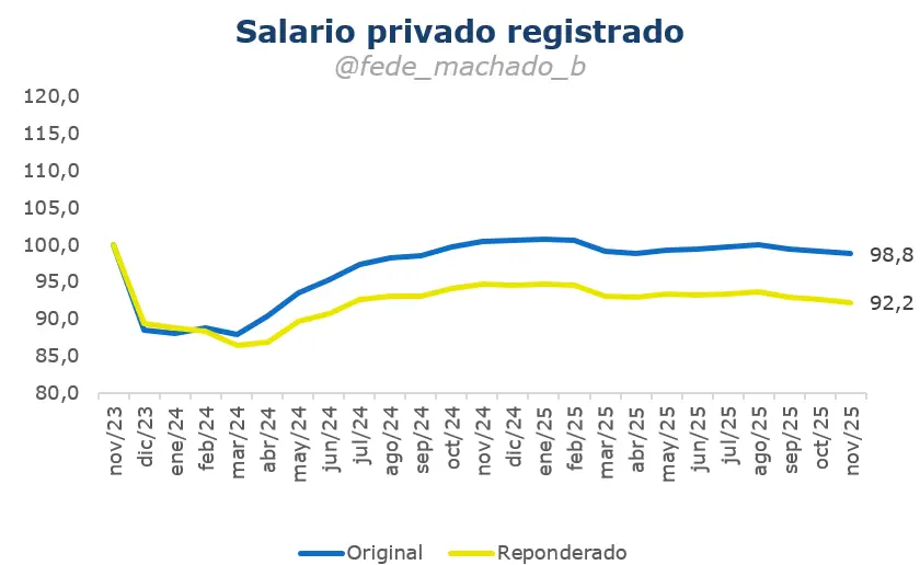 Esto impacta además de forma directa en los salarios: la caída del salario real privado registrado entre noviembre de 2023 y noviembre de 2025 pasa de -1,2% a -7,7% con la actualización de canastas. “Se entiende así porque, aun cuando el “salario sobre IPC” cayó poco más de 1% en el período, la cantidad de horas trabajadas, el pluriempleo y la irregularidad de cartera de las familias están en máximos de los últimos veinte años”, explicaron los especialistas.
