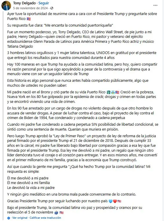 La historia de Tony está atravesada por la cárcel. Su padre, Henry Delgado, pasó 33 años preso por cargos vinculados al narcotráfico. Fue condenado bajo la ley contra el crimen impulsada en 1994, que establecía cadenas perpetuas sin posibilidad de libertad condicional. La liberación de Henry llegó en 2018, cuando Trump firmó la "Ley de Primer Paso", una reforma que permitió revisar condenas consideradas desproporcionadas. La foto de padre e hijo junto a Trump, celebrando la libertad con una bandera de Estados Unidos, se viralizó en las redes y funcionó como pieza clave en la estrategia de Delgado para captar el voto hispano.