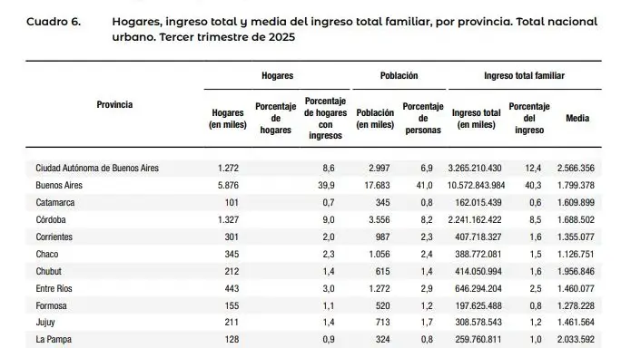 En la Ciudad de Buenos Aires, la media de los ingresos familiares fue de 2,5 millones de pesos mientras que la provincia de Buenos Aires se ubicó en los 1,7 millones, dato similar al promedio de todo el país.