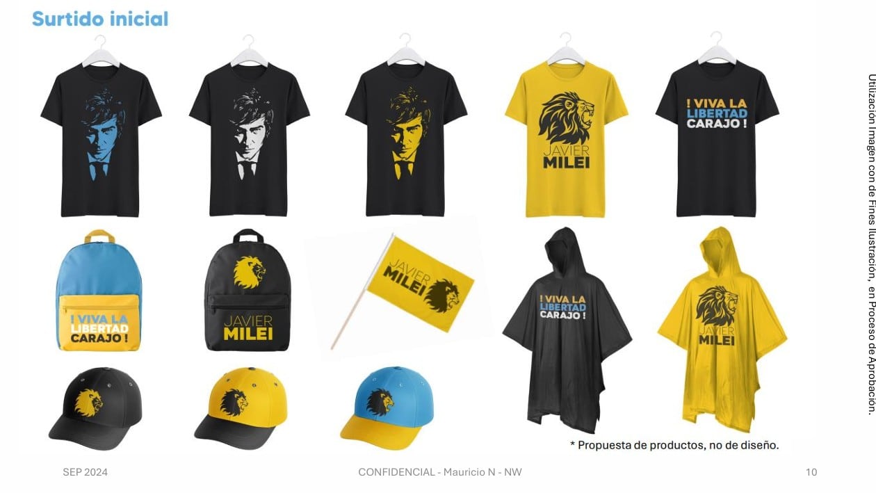En vías de hacer negocios con la cara de Milei, el grupo proyectaba la venta masiva de merchandising con el rostro del presidente argentino. En el documento “Project: Merchandise JM”, Beck menciona remeras, buzos con capucha, mochilas, gorras, motosierras, lentes de sol y hasta bebidas energizantes.