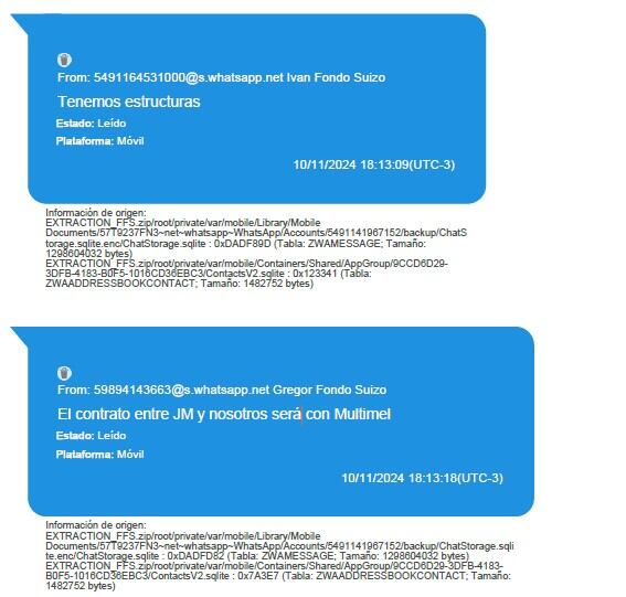 El archivo hallado en el teléfono de Novelli tiene además su correlato en los chats de su cuenta de WhatsApp peritados por la Dirección General de Investigaciones y Apoyo Tecnológico a la Investigación Penal (DATIP). El trader responsable de NW Professional conversaba con Gregor Beck, integrante del Consejo de Administración del Bank Von Roll de Suiza, e Iván Canales Vandewijngaerden, director ejecutivo de ICV Advisors y gerente de Relaciones de Degussa, una firma europea con base en Alemania especializada en la comercialización de metales preciosos como oro, plata y platino.