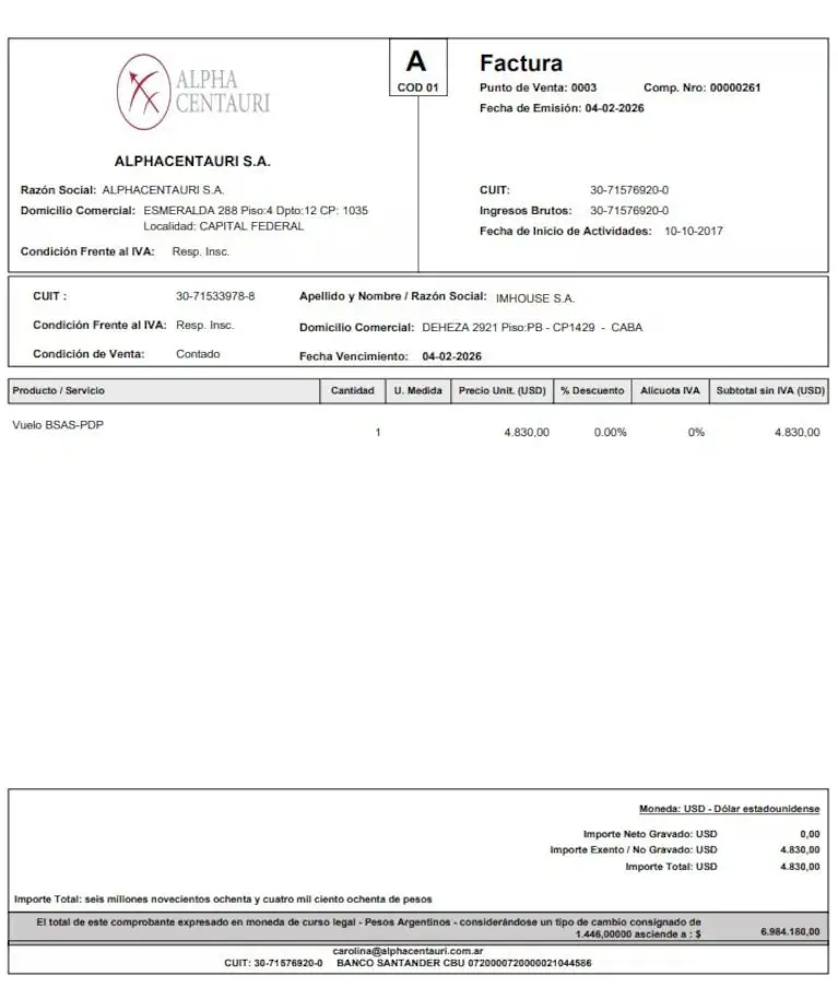 Por último, Pollicita pidió que se reconstruya la trazabilidad del dinero utilizado en la empresa “Alpha Centauri S.A.” contratada para el viaje y ordenó secuestrar las imágenes internas y externas del aeropuerto de San Fernando con la salida de Adorni, su familia y Grandio.