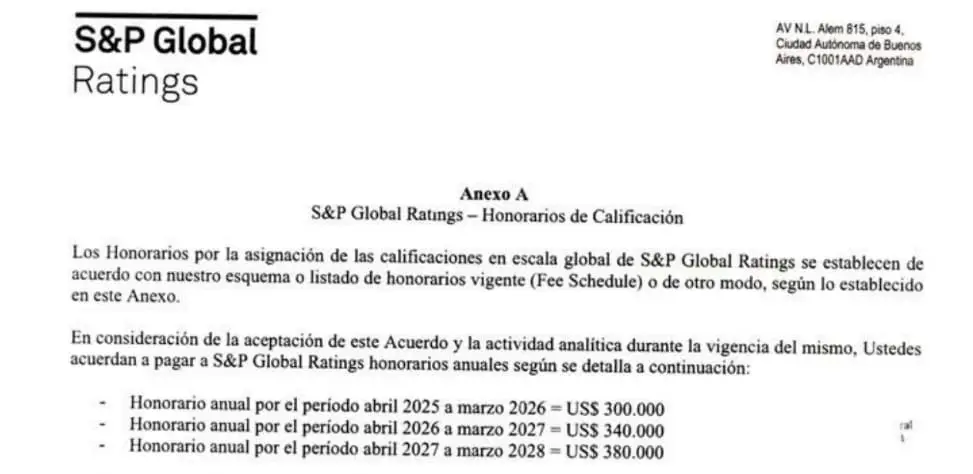 El acuerdo con S&P Global se extiende desde este mes hasta marzo de 2028 y se abonará en tres cuotas anuales de 300 mil dólares el primer año, 340 mil dólares el segundo año y 380 mil dólares el último año.