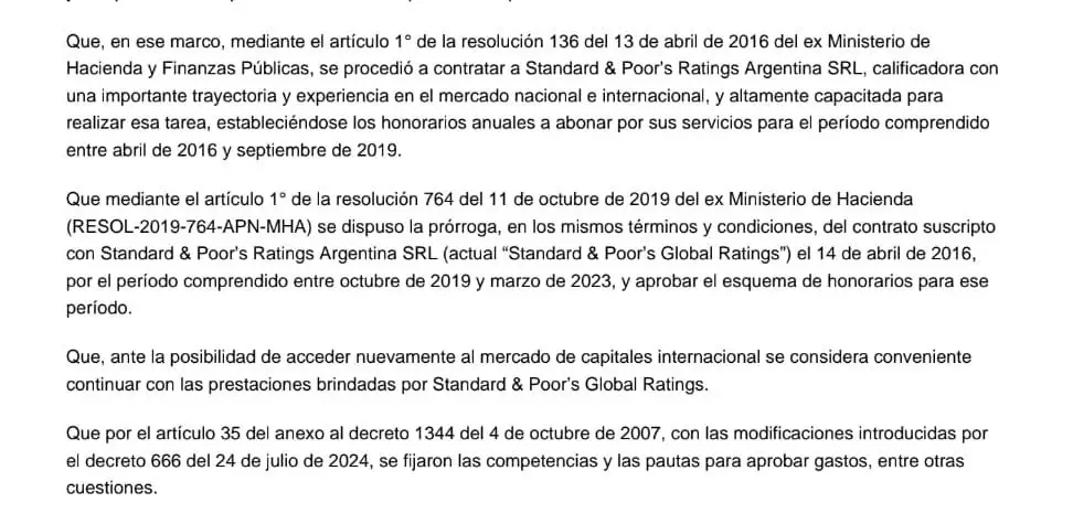 La administración de Milei renovó un contrato en forma directa con la calificadora de riesgo Standard & Poor’s por más de un millón de dólares a pagar en tres años para que haga la evaluación de la solvencia “ante la posibilidad de acceder nuevamente al mercado de capitales internacional”. No es obligatorio contar con esa calificación.