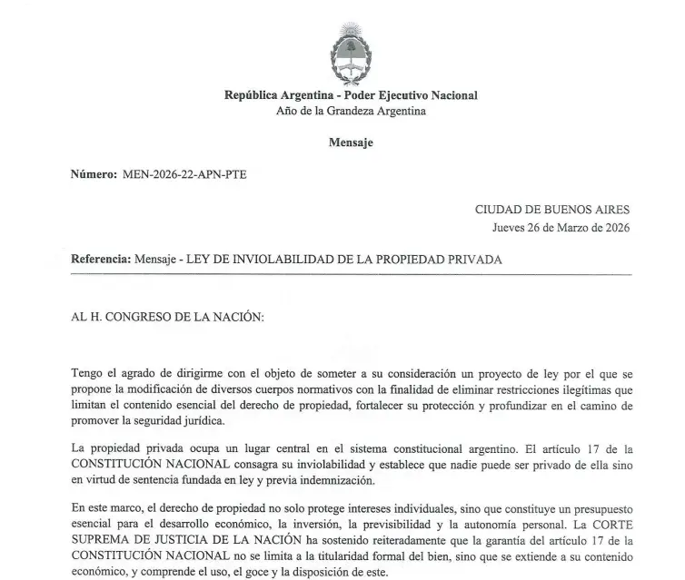 El mismo 7 de abril, pero en el Salón Azul del Senado, el ministro de Desregulación Federico Sturzenegger se presentó ante el plenario de las comisiones de Asuntos Constitucionales y de Legislación General del Senado para defender un proyecto que, en su nombre, promete protección y, en su articulado, habilita el despojo. La Ley de Inviolabilidad de la Propiedad Privada —ingresada el 26 de marzo con el número de mensaje MEN-2026-22-APN-PTE— tiene la apariencia de una reforma técnica y la ambición de una reforma estructural: modifica seis marcos normativos distintos, altera el régimen expropiatorio, desregula la tenencia de tierras rurales por parte de extranjeros, agiliza los desalojos hasta reducir los plazos a niveles que no tienen precedente en la región, y desmantela las restricciones ambientales que impedían el cambio de uso de suelo en zonas afectadas por incendios forestales.